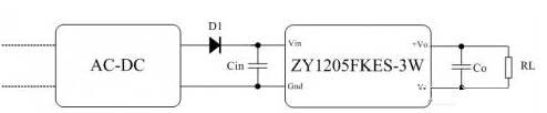 AC-DC電源模塊輸出電壓為12V,最大輸出電壓精度為±3%,那么輸出電壓范圍是11.64V~12.36V。而二極管D1使用1N4148,正向?qū)▔航禐?.7V,那么ZY1205FKES-3W模塊實際輸入電壓的范圍只有為10.94V~11.66V,這個電壓范圍還是在ZY1205FKES-3W模塊的輸入電壓范圍內(nèi),模塊可以正常工作,只是輸出電壓會較低。